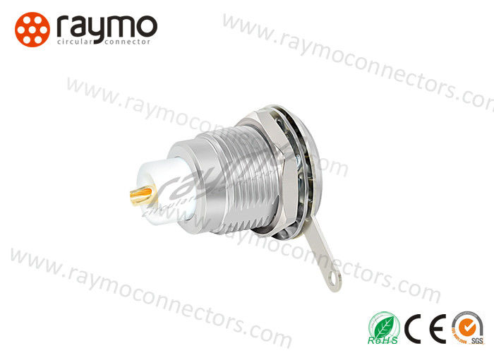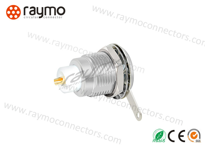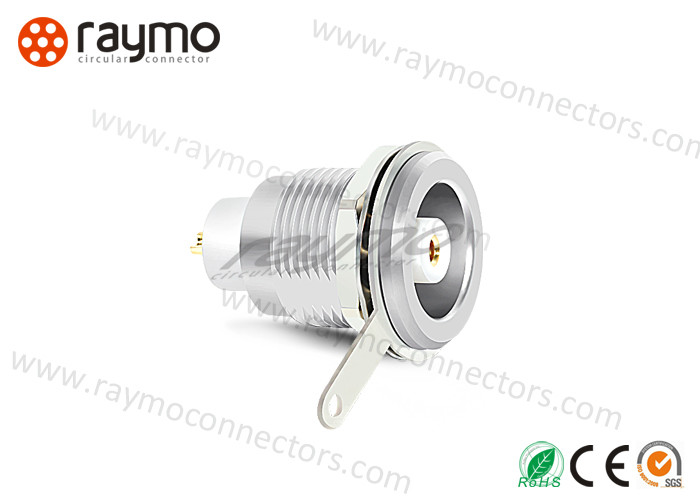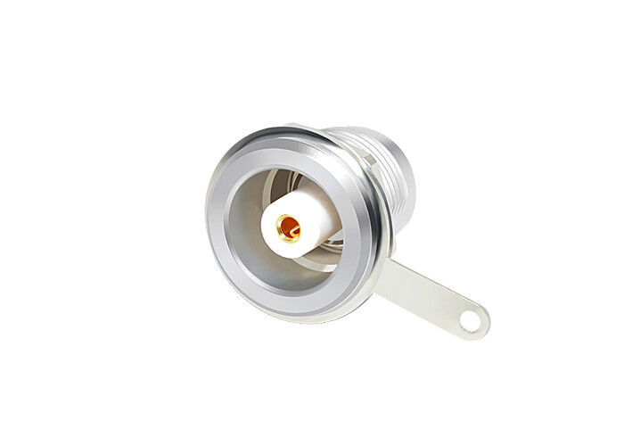 soquete fixo, fixação por porca, série 00S, tipo multipolar com contatos coaxiais de 50ohm, concha externa em latão cromado, isolador PPS |