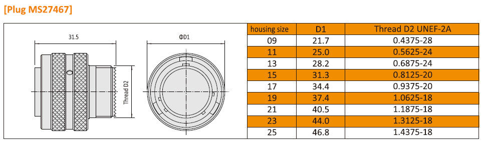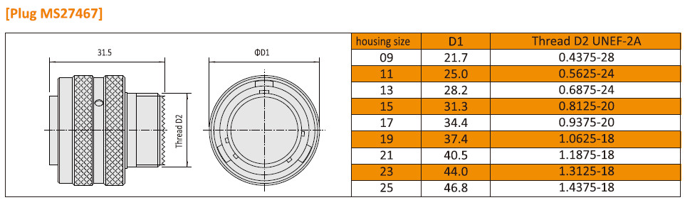Dados elétricos e dados mecânicos para Amphenol MIL-DTL-38999 I Series padrão militar JY27467 Militar Conectores Circulares